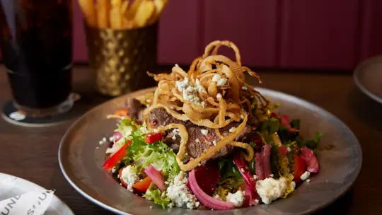 Sliced steak served on mixed seasonal leaves tossed in blue cheese vinaigrette, with pickled red onions, red peppers, cherry tomatoes, topped with shoestring crispy onions and crumbled blue cheese.